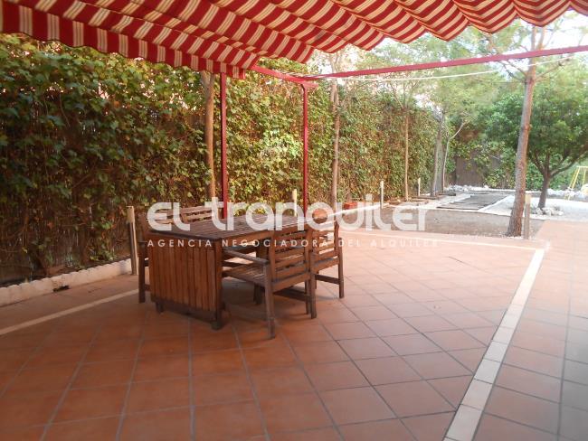 Se alquila magnifica vivienda en planta baja de 150 m2 (102 m2útiles) según catastro y patio privado de 200m2 en urbanización cerrada. Consta de 3 amplios dormitorios, 2 baños completos (uno en suite), salón comedor, cocina independiente equipada con electrodomésticos y terraza tendedero. Dispone de puerta blindada, armarios empotrados, suelos de parquet, ventanas climalit, calefacción individual de gas natural y aire acondicionado. El patio dispone de pérgola, sistema de riego, luces de exterior, rejas de seguridad en ventanas y caseta. Incluye plaza de garaje y trastero. Finca con piscina, pista de pádel y zonas ajardinadas, con acceso directo desde el jardín de la vivienda. Se alquila vacío de muebles. Finca con ascensor.