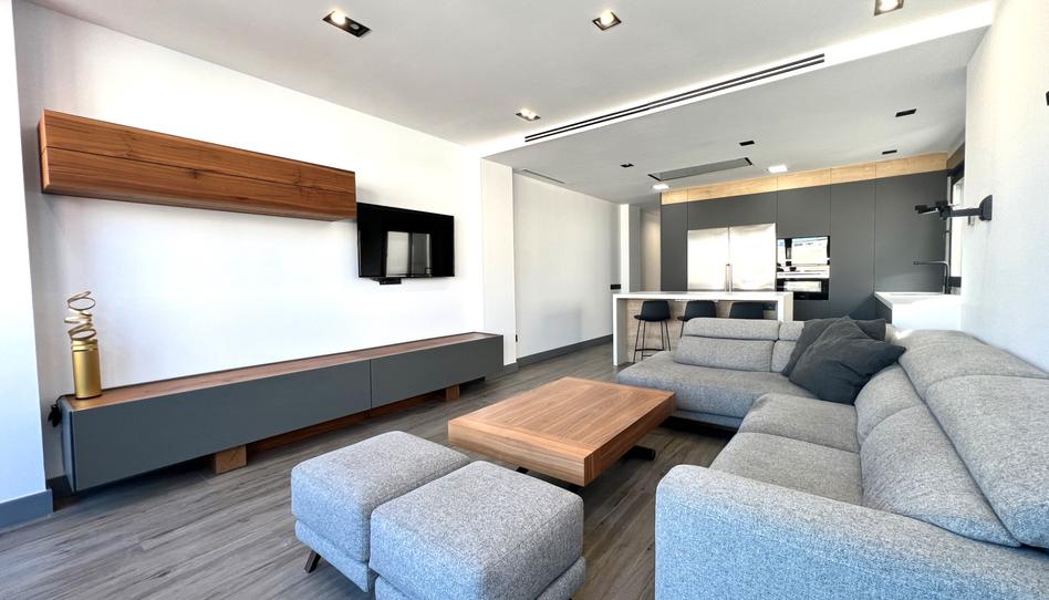 Su amplio salón, bañado en luz natural gracias a su disposición exterior, tiene acceso a una preciosa y gran terraza, equipada con todos los lujos, toma de gas natural para conectar paellero, toldo eléctrico y suelo de tarima.