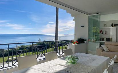 Con impresionantes vistas frontales al mar, que alcanzan Gibraltar y la costa africana, y acceso directo a la playa, este exclusivo apartamento en primera línea se sitúa en la prestigiosa urbanización Doncella Beach, en la codiciada zona de Seghers, Estepona. Ubicado junto a la Playa del Cristo, una de las mejores playas de la ciudad, y conectado directamente al paseo marítimo, se encuentra a agradable distancia a pie del puerto deportivo y del centro urbano. La propiedad combina lujo, confort y tranquilidad, ofreciendo una superficie construida de 88,15 m² y una amplia terraza privada de 40,86 m², diseñada para disfrutar del Mediterráneo durante todo el año. La terraza, completamente acristalada permite una transición fluida entre interior y exterior, creando el escenario perfecto para relajarse o disfrutar de veladas frente al mar durante todo el año. El interior destaca por sus altas calidades y cuidada construcción: aislamiento acústico entre viviendas, de persianas eléctricas, suelos de mármol crema REAL BIANCO, aire acondicionado, sistema domótico KONNEX, suelo radiante eléctrico y grandes ventanales que maximizan la luz natural y las vistas. Todo el espacio refleja una sensación de elegancia atemporal y bienestar. El amplio salón de concepto abierto, desde el que ya se disfrutan las vistas al mar, actúa como el corazón de la vivienda. Con acceso directo a la terraza, conecta de forma armoniosa con todas las estancias, creando un espacio luminoso, acogedor y perfectamente integrado. La cocina contemporánea, totalmente equipada, dispone de electrodomésticos SIEMENS, encimera de Silestone, detector de humos y un práctico lavadero independiente y cerrado con ventanas de cristal, ideal para un comedor privado para la cuotidianidad. El apartamento ofrece dos dormitorios con baño en suite, concebidos como espacios privados y confortables. La suite principal disfruta de vistas al mar desde la propia cama, acceso directo a la terraza, e incluye un baño privado con doble lavabo, amplia ducha y una elegante bañera de hidromasaje, convirtiéndose en un auténtico refugio de descanso y bienestar. Los baños están equipados con encimeras de mármol TRAVERTINO NAVONNA, grifería HANSGROHE y aparatos sanitarios de primeras marcas como Jacuzzi y Duravit, reflejando un alto nivel de detalle y calidad en cada acabado. Dentro de esta comunidad cerrada y exclusiva, los residentes disfrutan de auténticas comodidades de estilo resort: piscina comunitaria clorada por sal, piscina infantil, zona spa con jacuzzi, sauna y baño turco, gimnasio completamente equipado y un chiringuito de uso estival. Todo el recinto está totalmente cerrado, con cámaras de seguridad, centro de control y vigilancia avanzada mediante sistema de videoanálisis, garantizando privacidad y tranquilidad absolutas. La propiedad incluye además aparcamiento privado y un amplio trastero, así como acceso por ascensor, garaje comunitario y excelente conexión con transporte público, colegios y campos de golf cercanos. Una vivienda excepcional frente al mar, donde las vistas, la ubicación y las calidades premium se unen para ofrecer una experiencia residencial única en una de las urbanizaciones más exclusivas de Estepona.