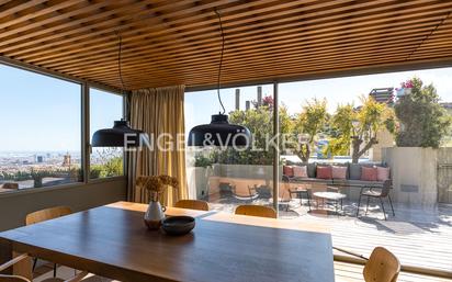 En la zona alta de Bonanova encontramos este luminoso ático con vistas panorámicas al mar y a la ciudad desde una gran terraza con piscina privada y ubicado en el fantástico complejo residencial de Torre Vilana. La vivienda, de 168m2 construidos y reformada de diseño, dispone de dos estupendas terrazas de 160m2 y de 20m2, siendo todas sus estancias exteriores. La terraza principal, con su inmejorable paisaje, permite su disfrute todos los días del año e incluye una estupenda piscina privada, una kitchenette con barbacoa y una zona de chill out. La terraza pequeña tiene acceso desde la cocina y es el lugar para disfrutar de un comedor de verano con la visión de Barcelona. La zona de día la compone el salón y el comedor, ambos con espectaculares vistas; una cocina independiente; una práctica sala de estar de diario más zona de despacho. En la zona de noche se encuentran tres dormitorios grandes. La habitación principal, con baño en suite, tiene salida directa a la terraza. Otro baño da servicio a los dos dormitorios con orientación a Collserola. Área de lavandería independiente. Calefacción y aire acondicionado por conductos. Trastero equipado con armarios roperos y dos plazas de aparcamiento con dos boxes cerrados para bicicletas y material de deporte.en el mismo edificio completan esta propiedad. La comunidad dispone de servicio de conserjería y de vigilancia 24 horas. Gran zona comunitaria con piscinas, pista polideportiva, pistas de pádel, vestuarios, área infantil de juegos y un gran jardín que rodea toda la urbanización. La propiedad se encuentra ubicada en La Bonanova, uno de los barrios más exclusivos de la zona alta de Barcelona, en un lugar muy tranquilo y residencial y a su vez cercano a Plaza Bonanova y entorno. Los alrededores cuentan con instalaciones deportivas de calidad, colegios de primer nivel y universidades de reputado prestigio. Las comunicaciones en coche disponen de acceso directo a la Ronda de Dalt, lo cual es muy cómodo para desplazarse de forma rápida hasta el aeropuerto y a las principales autopistas de salida de la ciudad. También en las cercanías se encuentra transporte público hasta el centro y hacia otros barrios de la Ciudad Condal. Otro aspecto interesante para quien aprecie el deporte al aire libre es la proximidad a la Carretera de les Aigües, punto de partida de numerosas rutas a pie o en bicicleta por la Sierra de Collserola.