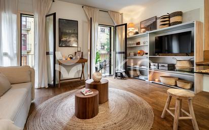 Situado en uno de los rincones más auténticos de Barcelona, este apartamento renovado de un dormitorio ofrece una experiencia de vida tranquila en Sant Pere, Santa Caterina i la Ribera. Ubicado en la Plaça de les Olles, a pocos pasos de El Born, está rodeado por el mercado de Santa Caterina, el Parc de la Ciutadella y una vibrante mezcla de cafeterías, galerías y boutiques locales. El interior, de 60 m², ha sido completamente renovado por nuestro equipo de diseñadores de interiores, con cálidos suelos de madera, líneas arquitectónicas limpias y materiales naturales que realzan la luz y el confort. La distribución incluye una luminosa zona de estar, un dormitorio con baño y un moderno cuarto de baño. El apartamento cuenta con calefacción por conductos, aire acondicionado split, excelente luz natural y un ambiente tranquilo, todo ello en un edificio recientemente reformado con ascensor. Una oportunidad única para adquirir una vivienda cuidadosamente diseñada en el corazón de la ciudad. Póngase en contacto con nuestro equipo para obtener más información o concertar una visita.
