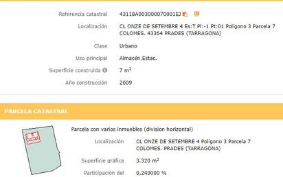 Suelo urbano de uso residencial en calle Onze de Setembre, en el municipio de Prades, provincia de Tarragona. Dispone de una superficie de 3320 m2. La topografía natural del terreno es llana, con fachada a dos calles. Se trata un terreno urbano consolidado La caracterización urbana, es que se trata de una zona con desarrollo finalizado, con una consolidación de nivel medio alto. Existe pavimentación, alcantarillado, suministro de agua, suministro de luz, existe suministro de gas por red general, dispone de postes de servicio telefónico, alumbrado público, la conservación de la calidad de las infraestructuras colindantes es de nivel medio. El proyecto de construcción consistía en conjunto residencia de dos bloques, con 10 viviendas 10 parkings y 6 trasteros, en plantas sótano, baja, primera, segunda y bajo cubierta. .