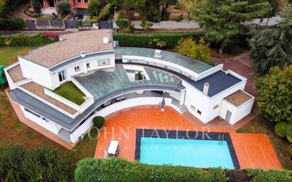 Magnífico chalet unifamiliar de original diseño semicircular en la exclusiva zona de Yucatán-Las Cornisas en Las Rozas. La propiedad cuenta con 991m² construidos y una parcela de 2.550m², ofreciendo un amplio espacio para disfrutar al aire libre y de la más absoluta tranquilidad. La casa se distribuye en tres amplias plantas, luminosas y perfectamente conectadas. Desde el elegante hall de entrada, se accede a un precioso salón-comedor, con acceso directo a la cocina, a 5 de los dormitorios y baños y a un gran porche semicircular y terraza con vistas al jardín que rodean toda la vivienda, creando una experiencia de vida interior-exterior sin interrupciones. En la planta superior, encontramos el dormitorio principal, un vestidor, cuarto de baño en dos alturas con jacuzzi, zona despacho-biblioteca y 2 terrazas con vistas al jardín. Y en la planta baja encontramos una gran sala de cine, un baño completo, un amplio trastero, una pista de pádel privada, y un amplio garaje con capacidad para más de 3 vehículos. Con respecto a los exteriores el jardín, cuenta con una extraordinaria belleza paisajística, albergando una gran piscina, una barbacoa, un espacio con zona para comer y una cuidada pradera de césped. Y en cuanto a su cercanía con los distintos servicios que ofrece la zona, podremos encontrar gran oferta comercial, y educativa a tan solo 10 mn en coche. Además de ofrecer fácil acceso a la A-6 y a la estación de tren de Majadahonda y de Las Rozas.