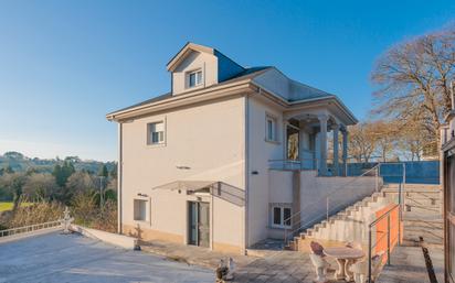 Esta propiedad se encuentra en Castro de Rei, Lugo, sobre una finca de 3.630 m² con jardines cuidados y río truchero que delimita la propiedad. La vivienda es un chalet moderno distribuido en tres plantas. La planta baja incluye entrada principal con vestíbulo y ascensor, dos cocinas completamente equipadas, amplio salón con chimenea y acceso directo a jardines, despacho-biblioteca, gimnasio completamente equipado, sala de calderas y guardarropa. La primera planta cuenta con dormitorio principal con chimenea de granito y baño en-suite con bañera de hidromasaje, habitación de invitados, tercer dormitorio doble y cuarto de baño familiar con bañera de hidromasaje y bidé. La planta superior es una unidad independiente con amplio rellano, tres dormitorios adicionales y un baño, perfecta para invitados o uso independiente. Los jardines se distribuyen en diferentes niveles con césped, árboles frutales y zona de cultivo. La propiedad incluye zona de barbacoa cubierta con columnas de granito y sauna en edificación independiente. Los grandes ventanales ofrecen vistas panorámicas al paisaje rural y al río.