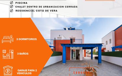 CABOKEY VENDE CHALET EN RESIDENCIAL PRIVADO COTO DE VERA - VERA PLAYA. Puerto Rey es un complejo turístico situado en la costa almeriense, a unos 100 kilómetros de Almería capital. Es un lugar ideal para vacaciones de sol y playa, con hermosas playas, aguas cristalinas y un clima cálido durante todo el año. El chalet está situado en una zona tranquila y residencial de Puerto Rey, estando cerca de todos los servicios necesarios, incluyendo restaurantes, supermercados, tiendas y un centro de salud. También está cerca de la playa, a pocos minutos en coche. El chalet está equipado con todas las comodidades contando con terrazas en los dormitorios de la primera planta, solarium en la azotea y una amplio porche-jardin privado, y garaje para dos vehículos con dos puertas independientes en sotano. También cuenta con zonas comunes exclusivas con piscina gran piscina, zona infantil y zonas verdes. Las playas Puerto Rey cuenta con varias playas hermosas, incluyendo la Playa de Puerto Rey, la Playa de Vera y la Playa de Mojácar. Estas playas son ideales para nadar, tomar el sol, practicar deportes acuáticos y relajarse. Algunas de las playas más hermosas de España. Las playas son de arena blanca y fina, y el agua es cristalina y azul. El clima El clima de Puerto Rey es cálido durante todo el año, con temperaturas medias que oscilan entre los 18 y los 25 grados centígrados. Puerto Rey es un lugar ideal para vacaciones de sol y playa, con hermosas playas, aguas cristalinas y un clima cálido durante todo el año. Ambiente Vera Playa - Puerto Rey es un pueblo tranquilo y relajado. El pueblo está lleno de casas blancas con techos rojos y calles estrechas. Hay muchos restaurantes, bares y tiendas en el pueblo, así como un mercado semanal. Atracciones turísticas Además de sus hermosas playas, Vera Playa - Puerto Rey también tiene una serie de atracciones turísticas. El pueblo cuenta con un castillo del siglo XVII, un museo arqueológico y un parque natural. El pueblo también está cerca de las ciudades de Almería y Granada, que ofrecen una variedad de atracciones culturales y históricas. Cómo llegar Vera Playa - Puerto Rey se encuentra a unos 300 kilómetros de Madrid y a unos 200 kilómetros de Barcelona. El pueblo está conectado por carretera con las principales ciudades españolas. El aeropuerto más cercano está ubicado en Almería. Gastronomía La gastronomía de Vera Playa - Puerto Rey es una mezcla de cocina española e internacional. Actividades Vera Playa - Puerto Rey es un destino turístico ideal para una variedad de actividades. El pueblo ofrece una variedad de playas, deportes acuáticos, actividades culturales y excursiones. Invierno Vera Playa - Puerto Rey es un destino turístico ideal también en invierno. El pueblo ofrece una variedad de actividades culturales, deportivas y de ocio. ** CARACTERISTICAS ** - Residencial Coto de Vera. - Chalet pareado en Puerto Rey dentro de urbanización privada con piscina, portero y vigilancia 24 h. - Orientación sur oeste. - Colegio, instituto y centro medico en alrededores. - Mercadona a 5 min a pie. - Zonas verdes en comunidad. - Playa a 10 min en coche. - Todo exterior. - 3 plantas - Garaje en sótano para dos vehículos con puertas independientes. - Armarios empotrados - Cocina Amueblada y equipada y barra americana a salón. - Zona aire libre jardín. - Porche y parcela individual con posibilidad de construir piscina privada. - Vídeo portero - Alarma - Suelos de tarima, gres y granito. - Paredes lisas. - Baños con platos de ducha. - Planta baja con salón cocina, baño y dormitorio. - 3 Dormitorios con armarios empotrados. - Planta alta con 2 dormitorios con terraza y baños en suite cada uno. - Cubierta con solárium. - Ventanas tipo climalit. - Escaleras de granito. - Sótano para hacer dormitorios, sala cine, gimnasio y bodega o zona de ocio independiente.