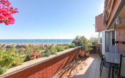 Ubicado en Las Terrazas de Sitges (Castelldefels), rodeado de todos los servicios que puedas precisar, se presenta este funcional ático dúplex de 261 m2 construidos con unas vistas al mar de escándalo. Al entrar, con la luz natural como protagonista, nos da la bienvenida un fantástico salón-comedor con amplios ventanales junto a una cocina independiente y un baño. Todos los ambientes de este nivel tienen salida a una gran terraza con vistas despejadas al mar. En la planta superior, se presenta la zona de noche, compuesta por una habitación en suite (doble con baño y terraza privada) junto a otras tres habitaciones más y un despacho que comparten otro baño completo. Esta propiedad se destaca por tener las persianas y toldos eléctricos, descalcificador de agua, osmosis, bomba de aire frio/calor nuevas y un ascensor interno que comunica ambas plantas entre sí. También incluye una plaza de parking y acceso a la inigualable zona comunitaria compuesta por piscina, pista de tenis, pista de pádel, campo de básquet, campo de fútbol, amplias zonas ajardinadas, zona de barbacoa, club social, parque infantil, ascensor y conserje. Un sueño hecho realidad a solo diez minutos andando de la playa y a quince en coche del aeropuerto de Barcelona.