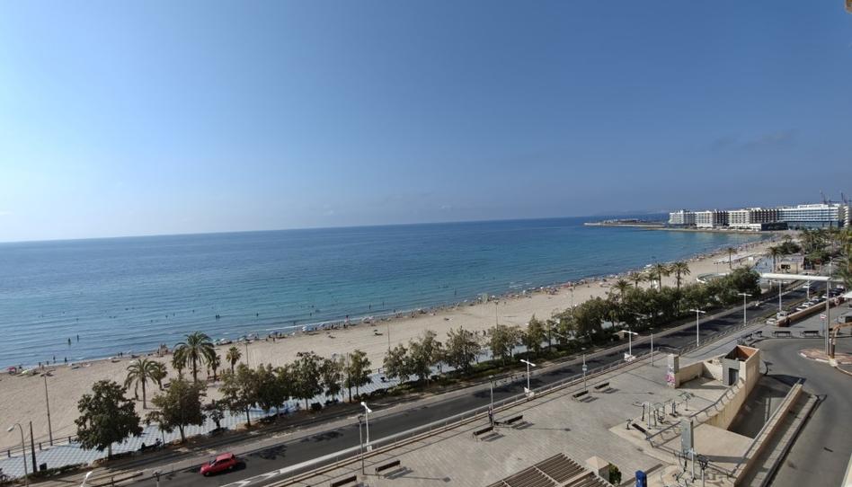 vistas al mar y al Castillo de Santa Bárbara, terraza privada, orientación este, 5ª planta con ascensor, 3 dormitorios, 2 baños completos, cocina independiente equipada, aire acondicionado, acceso directo al sótano, primera línea de playa, zona bien comunicada, todos los servicios cerca, posibilidad de reforma con gran potencial.