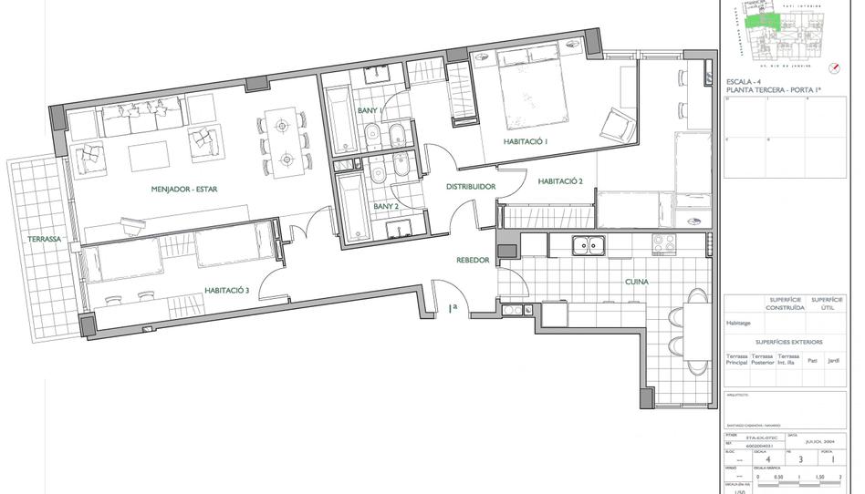La vivienda disponible tiene un programa funcional de: salón-comedor, tres dormitorios, uno de ellos doble en suite con baño completo, otro baños y cocina office.