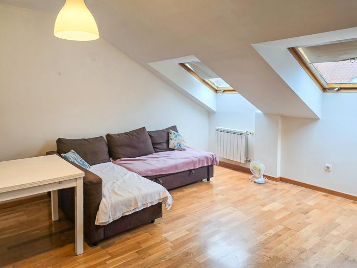 Este piso está equipado con ventanas Velux con cámara de aire que aportan luz natural, puerta principal de seguridad, paredes lisas, suelo de tarima de madera y carpintería interior de madera. Además, cuenta con armarios empotrados tanto en el dormitorio principal como en la entrada, maximizando el espacio de almacenamiento.
