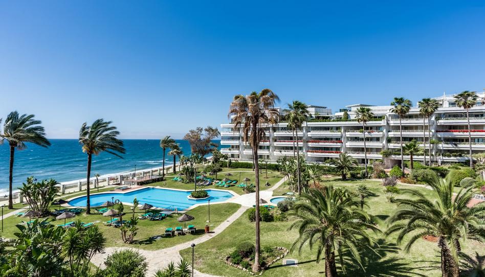 Impresionante apartamento en primera línea de playa Playa Esmeralda, situado en la prestigiosa Milla de Oro de Marbella. Esta comunidad buscada está cerrada con seguridad 24 horas, piscinas comunitarias, gimnasio y acceso directo a la playa. La propiedad tiene una gran sala de estar y comedor con acceso directo a la terraza con increíbles vistas al mar; cocina totalmente equipada; dormitorio de invitados; baño de invitados; y suite principal con acceso a la terraza. Otras características incluyen aire acondicionado frío y caliente, una plaza de aparcamiento privado y un trastero.