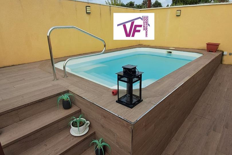 SE VENDE ESTUPENDO CHALET ADOSADO LISTO PARA ENTRAR A VIVIR con 3 dormitorios (uno de ellos en altillo), con armario empotrado, baño, salón, cocina americana completamente amueblada con electrodomésticos nuevos, patio trasero con caseta y patio delantero con porche y piscina de agua salada.