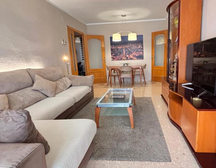 Salón comedor amplio con una gran puerta acristalada que nos da paso al balcón con vistas despejadas y donde podemos poner una gran mesa de terraza con sus sillas.