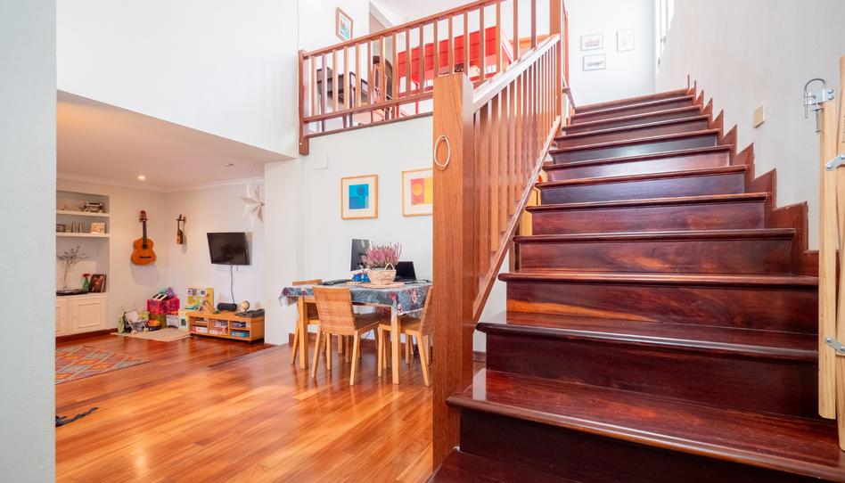 Planta baja: cocina de concepto abierto, conectada con el salón y la terraza; amplio salón con dos ambientes diferenciados; y baño completo. Los suelos de madera y las escaleras de diseño aportan calidez y carácter.