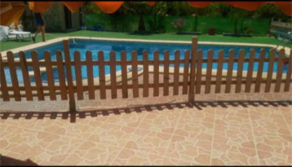 Casa con piscina barbacoa dos baños salón comedor cocina almacén frutales jardín balsa de riego subterránea.
