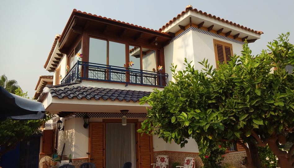 Fantástico dúplex en esquina adosado, reformado de lujo, de unos 120 m2 construidos en total y una terraza-jardín, porche y un gran trastero, de unos 150 m2, con árboles frutales, fuente artificial y numerosas plantas ornaméntales ( un paraíso ) en la estupenda urbanización de Veramar 1, a 300 metros de la playa.