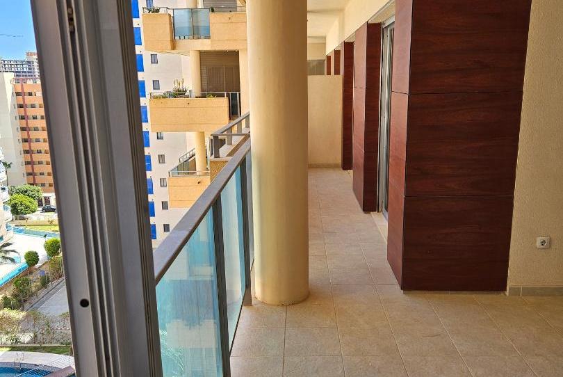 Dispone de 2 baños amplios con ventana ambos (uno en suite), hall del piso dispone de un gran armario empotrado, la cocina office está bastante bien de espacio y estado como se ve en las fotos, con ventana, galería con termo eléctrico, vistas a la zona de piscina y jardines, vistas al mar y a Benidorm.