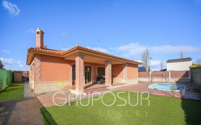 VIDEO INFORMATIVO: para verlo busque en youtube GRUPOSUR 10023. Les presento un exclusivo chalet independiente con piscina privada, construido en una única planta en el año 2006, en la urbanización El Soto, en Aldeamayor de San Martín, un complejo residencial situado a 15 minutos del centro de Valladolid por autovía. Una preciosa vivienda de 184 m² construidos, con salón, cocina, 4 dormitorios, 2 baños y garaje que forman un total de 160 m² útiles distribuidos en una planta. El Hall, de 8,17 m² con armario ropero, distribuye un dormitorio el garaje y la cocina a la derecha, el salón de frente, y un pasillo a la izquierda en el que se encuentran el resto de las estancias. El salón, de 26,61 m², tiene forma casi cuadrangular y dos grandes ventanales frontales que le proporcionan abundante luz natural y belleza. Una puerta de cristal en el salón da acceso al porche principal de la vivienda, de 21,30 m², que tiene bonitas vistas del jardín y de la piscina. La cocina tiene 23 m² y está equipada con mobiliario en color blanco. Dispone de encimera de silestone en color rojo y de electrodomésticos. Tiene dos puertas de acceso al exterior, una de ellas da acceso al lateral de la vivienda y la otra da acceso al porche principal que comparte con el salón. El garaje tiene 18,50 m² con capacidad para un coche y puertas motorizadas. En el exterior, junto a la puerta del garaje, hay una práctica caseta de herramientas. Desde el garaje se puede acceder a un trastero situado en el bajocubierta. Desde la entrada a la vivienda y a la izquierda, un pasillo con forma de L distribuye la suite de esta vivienda a la izquierda, el baño común en el vértice del pasillo, y otros dos dormitorios en el segundo tramo. La calefacción es de gas natural por suelo radiante, las puertas son de cerezo, los suelos son de gres y las ventanas son de PVC de imitación a madera con cristalería climalit. En total la parcela tiene una superficie de 611 m² con un bonito jardín provisto de césped artificial y de zonas pavimentadas con hormigón impreso. Cuenta con una barbacoa para comidas al aire libre. El jardín también dispone de una fantástica piscina con forma romana y de columpios para los más pequeños. Si desea más información o si desea solicitar una cita para visitar la vivienda no dude en ponerse en contacto conmigo. Me llamo Ana. Muchas gracias por su interés.