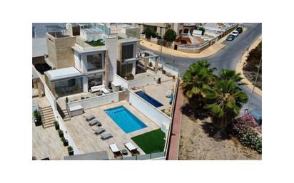 SEMI NUEVO. CHALET INDEPENDIENTE DE DISEÑO MODERNO. Vistas despejadas. Mucha luz. Situado en una tranquila zona residencial, andando a todo tipo de Servicios como Parada de Autobuses, Centros Comerciales, Tiendas, Supermercado Mercadona, Centro Comercial La Fuente, a menos de 1 km de los Campos de Golf de Las Ramblas, Campoamor Golf, Villamartín Golf, a 2 km del Centro Comercial Zenia Boulevard y a 5 km de las playas de Campoamor, Cabo Roig, La Zenia, Playa Flamenca,... La vivienda consta de planta baja, sótano y planta alta. Planta baja con parcela independiente, espacio y entrada de vehículos en la parte trasera, trastero. En su parte delantera cuenta con una entrada peatonal, una zona de piscina muy soleada, con tumbonas y una terraza ajardinada. Amplio salón comedor con cocina americana y galería con acceso a la zona trasera de la parcela con zona de coche y puerta de garaje. Baño completo, 2 habitaciones dobles. En la planta sótano se encuentra un salón comedor con cocina americana, dormitorio doble, un baño completo y en la planta superior hay un dormitorio con baño y una terraza solárium con vistas al mar y vistas despejadas. Se vende con parte del mobiliario según Inventario. Muchos extras. #ref:MLSC984716