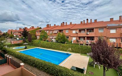 Se vende chalet adosado muy luminoso en la exclusiva zona de Las Rozas, Club de Golf, ubicada dentro de una urbanización privada con piscina y jardines. La casa se distribuye en tres plantas con 270m2 de vivienda. Cuenta con un amplio salón de 38m2, una cocina amueblada con zona office, zona lavadero/tendedero, cuatro dormitorios (principal en suite), dos baños completos, dos aseos, una sala de juegos o segundo salón con chimenea, un jardín privado de 40m2 con acceso a la piscina comunitaria y dos terrazas exteriores. Se encuentra en excelente estado y dispone de garaje cubierto con capacidad para tres coches, suelos de parquet, portero automático, calefacción de gas natural y doble acristalamiento. Ubicado en una zona residencial muy tranquila y muy bien comunicada con la carretera A-6, estación de tren Las Matas (C3, C8 y C10) a cinco minutos en coche y autobuses hacia Madrid.