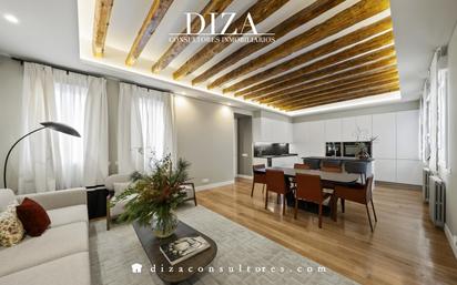 DIZA Consultores presenta esta espectacular vivienda situada en uno de los enclaves más exclusivos de Madrid, en pleno Recoletos, donde la arquitectura tradicional se fusiona con las comodidades más modernas. La propiedad se encuentra lista para entrar a vivir, con una reforma de autor, donde han empleado las mejores calidades del mercado, cuenta con un elegante hall de entrada, que nos distribuye la vivienda a la perfección. Antes de pasar a la zona social desde el hall de entrada, tenemos un salon/TV room muy acogedor para descansar del día a día. La zona social se encuentra integrada al completo (salón/comedor/cocina) con los espacios muy bien diferenciados gracias a sus grandes dimensiones, con un encanto y un diseño muy acorde a la zona, con esas vigas vistas de madera, una altura de techos de 3m y unas calidades excepcionales. La cocina, integrada al comedor, se convierte en otro de los grandes protagonistas de la vivienda, con una gran isla, electrodomésticos de última generación ocultos, gran capacidad de almacenaje, todo ello diseñado para garantizar funcionalidad sin renunciar a la estética. La zona de descanso ofrece tres dormitorios dobles, todos ellos con baño en suite, el dormitorio principal se encuentra completamente independiente de los secundarios para darle una privacidad absoluta. además de un aseo de cortesía. La vivienda se encuentra en un edificio clásico, con portero en finca. Gracias a sus amplios espacios y una distribución impecable, esta vivienda representa una opción ideal para quienes buscan confort, estilo y exclusividad en una de las áreas más codiciadas de la capital. Ubicado en Recoletos este piso ofrece un entorno privilegiado, rodeado de las mejores tiendas, restaurantes, galerías de arte y espacios culturales de la ciudad. DIZA Consultores Inmobiliarios Inmobiliaria de lujo en Madrid especializada en comprar, vender y alquilar propiedades en las zonas premium: Barrio de Salamanca, Almagro, Chamartín, Retiro, Aravaca, Pozuelo y Boadilla. Convertimos Sueños en Hogares