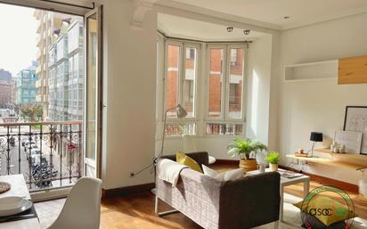 Ubicado en un edificio de 1920, al lado de la Plazuela San Miguel. Edificio clásico con elementos arquitectónicos originales y bien conservado. Esta vivienda de dos habitaciones no necesita grandes artificios para enamorar. Solo hay que abrir una ventana y mirar: la ciudad vibra abajo, el mar espera a tres minutos andando, y la luz entra como si supiera que aquí siempre es bienvenida.
