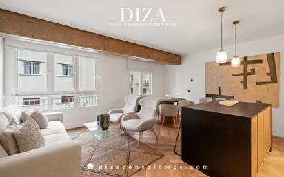 Piso reformado de lujo junto a Juan Bravo. DIZA Consultores les presenta exclusivo piso en el corazón del Barrio Salamanca, junto a Juan Bravo. En la cuarta planta de un edificio de mediados del siglo XX, encontramos este formidable piso de 96 metros. La zona noble goza de muchísima luz durante todo el día gracias a sus grandes ventanales, que miran a la calle Maldonado. Esta zona se compone de tres ambientes: zona de estar con sofás enfrentados, comedor con espacio para toda la familia y cocina con isla y todos los electrodomésticos panelados. Todas las estancias se encuentran integradas de forma armónica y agradable. La zona de descanso se compone de dos dormitorios, ambos con baño en suite. En el de la habitación secundaria se colocó doble entrada para ofrecer el servicio de aseo de cortesía para los invitados. La vivienda ofrece acabados con materiales nobles y su ubicación es una de las más demandadas del Barrio Salamanca por su posición estratégica. La reforma es a estrenar y la finca cuenta con portero. El barrio Salamanca se trata de una de las zonas más lujosas y con mejor calidad de vida de Europa. Gracias a la amplia oferta gastronómica, cultural y comercial, se trata de una formidable zona donde vivir e invertir. Estaremos encantados de atenderle. DIZA Consultores Inmobiliarios Inmobiliaria de lujo en Madrid especializada en comprar, vender y alquilar pisos en las zonas premium de Madrid: Barrio de Salamanca, Almagro, Chamartín, Retiro, Pozuelo, Aravaca, Boadilla. Convertimos Sueños en Hogares