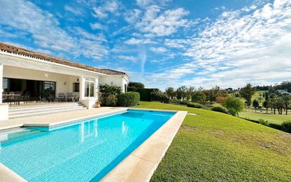 Impresionante villa de una sola planta situada en primera línea de golf en El Paraíso, con una orientación suroeste que garantiza sol durante todo el día. Una propiedad excepcional que destaca por su diseño contemporáneo y sus vistas panorámicas al campo de golf, al lago y a la exuberante vegetación circundante. Ubicada en una generosa parcela de 1.670 m², la vivienda cuenta con 450 m² construidos distribuidos íntegramente en un solo nivel para máxima comodidad. Consta de 4 amplios dormitorios y 3 baños, con una distribución de concepto abierto y grandes ventanales que maximizan la entrada de luz natural. La espaciosa sala de estar se integra perfectamente con una terraza cubierta, ideal para disfrutar de cenas al aire libre. La cocina está totalmente equipada con acabados de primera calidad, y la propiedad incluye extras funcionales como un garaje para dos vehículos y amplio espacio de almacenamiento. El exterior de la villa es un auténtico oasis de paz, compuesto por un jardín privado maduro y una piscina orientada a disfrutar de atardeceres inolvidables sobre el campo de golf. La ubicación en El Paraíso es privilegiada, ofreciendo un ambiente exclusivo y tranquilo, ideal para quienes buscan privacidad sin renunciar a la cercanía de los centros urbanos. El mantenimiento impecable de las zonas verdes y su integración con el entorno natural definen el carácter de esta propiedad. La urbanización se encuentra a solo unos minutos de San Pedro, Puerto Banús y Marbella, rodeada de los mejores servicios, restaurantes y playas doradas de la región. Su acceso estratégico permite combinar la vida activa de la Costa del Sol con la serenidad de una residencia en primera línea de golf. No pierda la oportunidad de adquirir esta villa de elegancia atemporal en una ubicación inmejorable. Contáctenos hoy mismo para organizar su visita privada.