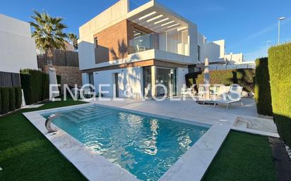 Este bonito chalet moderno e inteligente está orientado al sureste y tiene aprox. 122 m2 construidos, se ubica sobre una parcela de aprox. 224 m2 en la que se encuentra el espacio para aparcamiento, el jardín privado, la terraza y la piscina con una lámina de agua de unos 21 m2. La vivienda construida en 2018 consta de planta baja con un salón con cocina americana con electrodomésticos, un aseo de cortesía, y un dormitorio con acceso al exterior con armario empotrado. En la planta superior se encuentran otros dos dormitorios, ambos con baño en suite y terraza privada, y ambos con armarios empotrados, además el acceso al solárium donde se pueden disfrutar las vistas verdes abiertas y el clima mediterráneo. La vivienda dispone de aire acondicionado y se entrega parcialmente amueblada lista para vivir. Ubicada en Villamartin,la exclusiva zona de Orihuela Costa, esta propiedad ofrece un entorno ideal para aquellos que buscan un estilo de vida sofisticado y relajado. Orihuela Costa es conocida por su comunidad internacional, atrayendo a compradores que valoran la privacidad y el acceso a servicios de alta calidad. La infraestructura de la zona es excelente, con centros comerciales como Zenia Boulevard a solo 10 minutos en coche, ofreciendo una amplia gama de tiendas de lujo, restaurantes y entretenimiento. Para los amantes del golf, el prestigioso campo de golf de Villamartín está a solo 5 minutos en coche, proporcionando un entorno perfecto para disfrutar de este deporte en un clima soleado. Las playas de arena dorada, como Playa Flamenca, están a menos de 15 minutos, ideales para disfrutar del Mediterráneo. Orihuela Costa se distingue por su tranquilidad y belleza natural, con parques y senderos que invitan a paseos relajantes. Esta ubicación ofrece una combinación perfecta de lujo, comodidad y acceso a una vida vibrante. Aquí, cada día es una oportunidad para disfrutar de lo mejor que la vida tiene para ofrecer.