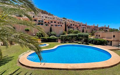 Adosado en esquina con terraza en la azotea en venta en Terra Moraira, Benitachell Esta encantadora casa adosada está idealmente situada al final de la calle en la Urbanización Terra Moraira, Benitachell, ofreciendo mayor privacidad y una plaza de aparcamiento privado con techado. Un par de escalones llevan a la propiedad, donde el nivel principal cuenta con una luminosa sala de estar con puertas correderas que se abren a la terraza, una cocina completamente equipada con barra de desayuno, y el dormitorio principal con baño en suite. La planta inferior ofrece dos dormitorios dobles, un baño compartido, y un útil armario en el pasillo. Desde la terraza principal, unos escalones conducen a una amplia terraza en la azotea, perfecta para disfrutar del clima mediterráneo. La comunidad también se beneficia de una piscina comunitaria y una piscina infantil separada, ambas rodeadas de áreas ajardinadas bien mantenidas, ideales para relajarse y el uso familiar.
