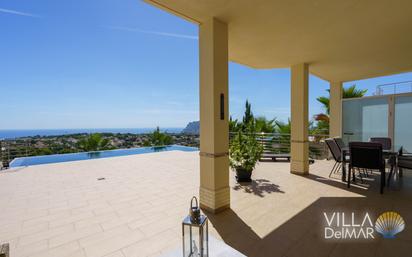 La villa está situada en una zona residencial preferida de Calpe con unas vistas únicas de toda la costa desde Calpe hasta Moraira. Usted tiene acceso directo al sótano de la villa a través de la entrada automática y puerta de garaje. Además del garaje doble, hay trasteros y el cuarto técnico. Puede tomar el ascensor o las escaleras interiores hasta la planta baja. Aquí le da la bienvenida un amplio y luminoso salón/comedor con acceso a la terraza cubierta y a la soleada terraza de la piscina con piscina infinita. La cocina equipada de alta calidad con comedor en la misma planta puede cerrarse al salón mediante una puerta corredera. La espaciosa escalera interior o el ascensor le llevan a la planta superior con cuatro dormitorios y tres cuartos de baño. Dos de los dormitorios con baño en-suite tienen acceso a la terraza superior, también con impresionantes vistas al mar. La propiedad es absolutamente fácil de mantener y está diseñada con palmeras, plantas autóctonas y terrazas. La villa tiene muchos detalles notables y extras como: garaje doble más plaza de aparcamiento, ascensor, paneles solares, piscina infinita, bañera de hidromasaje, calefacción por suelo radiante, aire acondicionado, aseo de invitados, así como muebles de alta calidad y decoraciones, por nombrar sólo algunos de los extras. No dude en concertar una cita de visita sin compromiso con nosotros.