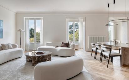 Piso en edificio clásico con vistas absolutas al Parque del Buen Retiro y orientación sur. Dispone de dos balcones a la calle en voladizo de fachada y un balcón-terraza. Tiene un gran salón comedor de 100 metros cuadrados con tres ambientes. La cocina abierta al salón está situada en el mejor lugar con el fin de dar armonía a todo el espacio social de la vivienda. Muebles lacados y de madera junto a los electrodomésticos Siemens Studio Line componen una cocina de diseño estiloso sin dejar de ser funcional. El piso cuenta con cinco dormitorios, incluyendo la sensacional suite principal y un dormitorio de servicio, todos ellos en suite. También dispone de un práctico aseo de cortesía cercano al área pública de la vivienda. La espléndida suite principal destaca por su luminosidad, además de por un amplio walking closet y un gran cuarto de baño completo incluyendo bañera y ducha. Además la vivienda cuenta con una amplia zona de lavado que incluye un área para cocinar, que da soporte a la cocina principal, y una entrada de servicio. Este piso absolutamente luminoso cuenta con una reforma de máxima calidad con suelos de madera natural en punta Hungría, acabados en mármoles y piedra campaspero. Detalles hechos a medida con un diseño personalizado. Carpinterías exteriores de la marca Cortizo con manivela y bisagra oculta. Las puertas de paso son de suelo a techo, también con bisagra oculta y manivelas Corston especialmente diseñadas para esta propiedad, al igual que los numerosos armarios empotrados. Los baños tienen un diseño moderno y cuidado con acabados en piedra natural y mamparas de vidrio Moru. Incluyen grifería Zucchetti e inodoros higiénicos Geberit, con instalación empotrada para conformar una composición más elegante. Sistema de climatización de aire acondicionado por conductos con Airzone y sistema de agua caliente mediante Aerotermia. La calefacción es central, pero cuenta con contadores individualizados. El portal se encuentra bien mantenido con una estética clásica de principios de siglo. Cuenta con servicio de portería, que vive en la finca. Se encuentra en pleno Recoletos a pasos del parque de El Retiro, en el mejor lugar para disfrutar de este emblemático parque madrileño dado que dos de las puertas principales están nada más cruzar la calle. El barrio de Salamanca es una de las zonas más relevantes de Madrid tanto por su peculiar distribución como por los vecinos que tradicionalmente han habitado sus emblemáticas calles. Su construcción data de la segunda mitad del siglo XIX y corresponde a la ampliación urbanística llevada a cabo durante el reinado de Isabel II. El precursor al que debe su nombre fue el malagueño José de Salamanca y Mayol, Marqués de Salamanca, quien concibió un nuevo emplazamiento con una cuidada edificación que albergara a las clases aristocráticas y burguesas de Madrid. De estilo decimonónico, se caracteriza por su especial distribución regular en forma de damero con calles perpendiculares. Sus edificios gozan de especial interés gracias a su calidad arquitectónica y la belleza de sus fachadas. Tradicionalmente, Salamanca fue una zona de uso residencial, especialmente habitada por las élites políticas y económicas del país. En los últimos cincuenta años este carácter residencial convive con otras actividades como la empresarial, la diplomática y especialmente la comercial ya que es una de las áreas de moda de lujo más importantes de la capital. En este barrio de Madrid y como auténtica joya del mismo y pulmón verde de la capital, encontramos el Parque del Buen Retiro.