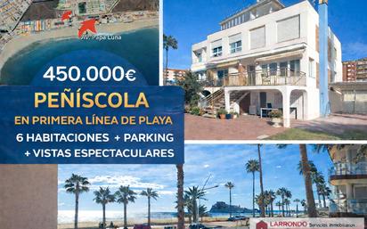 PEÑISCOLA (Avd. PAPA LUNA), PRIMERA LINEA DE PLAYA ADOSADO DE 6 HABITACIONES + PARKING PARA 4 COCHES + 2 TERRAZAS Y JARDIN Magnifica casa adosada a la venta en primera línea de Playa Peñíscola, vistas espectaculares, muy cerca al centro, tiene aparcamiento privado hasta para 4 coches. Es un terreno de 202 m2, y 155 m2 construidos, con planta baja mas dos plantas superiores, que están distribuidas de la siguiente forma: En la planta baja u dos dormitorios, 2 baños de los cuales ,uno está en la Suite y tiene bañera. preinstalacion de ascensor. La planta primera consta de Salón comedor y gran terraza con increíbles vistas al castillo y a la mar, cocina grande equipada y mucho espacio de almacenaje, vistas inmejorables; la segunda planta consta de 4 dormitorios, todos con vistas, 2 baños (Uno de ellos completo con plato de ducha). Todos los dormitorios y la cocina tienen ventiladores de techo. La casa cuenta con barbacoa, y un buen espacio de jardín con terraza. Orientación sur-este. chimenea. Dispone de licencia turistica