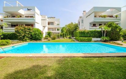 Luminoso y amplio apartamento ubicado en la exclusiva zona residencial de Bellresguard en Puerto de Pollensa, a escasos pasos del paseo Voramar y de la playa. Con una superficie de 136 m², la propiedad ofrece tres amplios dormitorios dobles, dos baños renovados, una cocina independiente, un gran salón-comedor y una generosa terraza de alrededor de 30 m² con acceso directo mediante escalera privada a la piscina y a los cuidados jardines comunitarios. Equipado con aire acondicionado y calefacción. Incluye ascensor y plaza de aparcamiento cubierta.