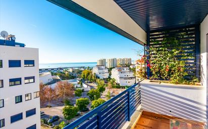 Fantástico Ático dúplex de dos dormitorios y dos baños, junto al puerto deportivo de Estepona. La vivienda tiene vistas al mar y se encuentra dentro de una cuidada urbanización con piscina y jardines comunitarios. Muy luminosa, dado a que todas sus estancias tienen ventanas al exterior. Se compone de hall de entrada equipado con un amplio armario, cocina equipada con lavadero, salón comedor con vistas al mar y acceso a una terraza cubierta donde se encuentra una escalera de caracol, que le lleva a un solárium de 45 m2, desde donde podrá disfrutar de fantásticas veladas con su familia y donde tendrá el privilegio de ver preciosos amaneceres y atardeceres desde su propio hogar. Ambos dormitorios tienen armarios empotrados y el dormitorio principal cuenta además, con baño en suite. La vivienda tiene suelos de mármol, ventanas Climalit, Aire acondicionado, garaje y trastero. Se encuentra muy cerca de todo tipo de servicios tales como restaurantes, farmacia, supermercado, estanco, ayuntamiento, etc... A pocos pasos de la playa y a un corto paseo hasta el centro del pueblo. Esta vivienda cumple con creces, todo lo que usted pueda desear que tenga su hogar. ¡¡Venga a verlo y posiblemente se enamorará!!