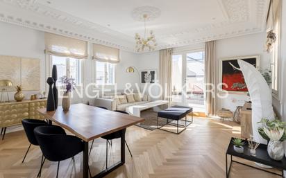 Engel & Völkers presenta este ático excepcional situado en un edificio clásico completamente rehabilitado en 2022, en plena Gran Vía, que combina el encanto arquitectónico original con el confort y la estética de una obra nueva. Con una superficie construida de 137 m² y aproximadamente 70 m² adicionales de terrazas, esta vivienda ofrece un estilo de vida único en uno de los enclaves más emblemáticos de Madrid. La propiedad se distribuye en un hall de entrada que da acceso a un amplio salón-comedor con cocina de diseño semi integrada y totalmente equipada. Esta zona social conecta con una de las grandes terrazas. La vivienda cuenta con dos dormitorios dobles y dos baños completos, uno de ellos en suite dentro de la habitación principal, equipada con armarios empotrados. El segundo dormitorio se ubica junto a otro baño completo, y el pasillo que los comunica disfruta de grandes ventanales con acceso a la terraza principal, aportando luz y amplitud a toda la vivienda. El ático destaca por sus altos techos, molduras y escayolas de época restauradas, combinadas con acabados contemporáneos como suelos de madera, carpinterías lacadas en blanco y contraventanas metálicas en tonos oscuros. El ático se entrega completamente amueblado con una selección exclusiva de mobiliario. La vivienda incorpora un avanzado sistema de climatización mediante suelo radiante-refrescante con aerotermia, aire acondicionado por conductos y domótica integrada para la gestión de los espacios. El edificio dispone de ascensor, servicio de portería y seguridad 24 horas, además de un portal elegante y una escalera principal que mantiene los elementos originales. En la última planta se encuentra una azotea comunitaria y un gimnasio, desde donde se disfrutan vistas privilegiadas al skyline madrileño. La Gran Vía es una de las avenidas más emblemáticas de Madrid, conocida por su arquitectura monumental, su ambiente vibrante y su amplia oferta cultural, comercial y gastronómica. Vivir en esta zona significa estar rodeado de edificios históricos, teatros, cines, tiendas de primer nivel y una excelente conexión con el resto de la ciudad. Se combina el valor patrimonial con la comodidad urbana: vistas icónicas, acceso inmediato a servicios y un entorno dinámico que la convierte en una de las localizaciones más exclusivas y demandadas de la ciudad y de España.