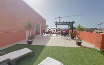 Espectacular ático en perfecto estado y exquisitamente decorado, está ubicado en un complejo residencial perimetralmente cerrado que dispone de piscina y jardines comunitarios, zona de recreo infantil y está ubicado a tan sólo 200 metros de la playa. La vivienda ha sido totalmente reformada y ofrece todo el confort necesario para entrar a vivir y disfrutarla. Se distribuye en dos amplios dormitorios (el principal con armario empotrado), dos baños completos (uno con bañera y el otro con plato de ducha), cocina americana de estilo moderno totalmente equipada, salón-comedor muy luminoso con acceso hacia dos terrazas (una lateral de unos 65 m2 que tiene pérgola y césped artificial , una terraza frontal con escalera de obra desde la cual se accede al solario de unos 55 m2 que también dispone de pérgola techada. Desde ambas zonas exteriores se disfrutan de vistas despejadas y panorámicas al mar, la vivienda tiene una excelente orientación, cuenta además con pre-instalación de aire acondicionado por conductos en toda la casa, todas las habitaciones son exteriores muy luminosas además de disponer de mosquiteras en todas las ventanas. Se incluye en el precio de venta, una plaza de parking techada, y un trastero. Este fantástico ático no estará mucho tiempo en el mercado, no lo dude y reserve su visita puede que pierda una magnífica oportunidad de adquirir una casa de ensueño en la playa. Para más información no dude en contactar con nosotros. Estaremos encantados de atenderle. Precio Actual + Impuestos (7% ITP). Este precio no incluye gastos de notaría y registrales. Los tipos aplicados son los más altos, pudiendo el comprador, por sus características, beneficiarse de algunas deducciones fiscales. EL COMPRADOR NO TIENE NINGÚN GASTO DE LA GESTIÓN DE LA INMOBILIARIA.