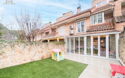 HOGARES MAJADAHONDA GOLF vende en exclusiva espectacular CHALET ADOSADO con las mejores calidades con piscina en la zona del Monte del Pilar. En la planta principal encontramos; Un recibidor que accede directamente a una gran cocina donde encontramos, gran espacio de office, con las mejores calidades en materiales, electrométricos, etc y aseo de cortesía. Seguidamente encontramos un gran salón que da paso a dos ambientes muy bien distinguidos, zona de comedor y la zona de estar muy acogedora, desde el mismo tenemos acceso al porche y al jardín privado. En el jardín encontramos zona de estar con acceso a una zona con césped. La primera planta se compone de; Dormitorio principal muy amplio y luminoso con vestidor incorporado, un cuarto de baño en suite con plato de ducha y bañera. Dos dormitorios secundarios amplios y con armarios empotrados vestidos. Un cuarto de baño independiente para dar servicio a estos. Planta segunda: Buhardilla totalmente equipada. En la planta sótano; Encontramos un garaje con puerta automática, un dormitorio, un cuarto de baño completo y zona de lavado. NO DUDE EN PREGUNTARNOS Y VISITARLA VIVIENDA. ¡FINANCIACIÓN 100%!