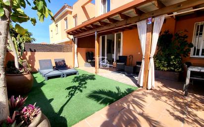 Chalet Adosado en Palm Mar GS Services presenta este atractivo chalet adosado en una de las zonas más demandadas del sur de Tenerife: Palm Mar. Una propiedad moderna, luminosa y funcional que combina a la perfección confort, diseño y una ubicación privilegiada a solo 5 minutos a pie del paseo marítimo. Distribuido en dos plantas, este hogar destaca por sus amplios espacios exteriores: Terraza frontal de 20 m², con un cuarto adicional de 10 m², ideal como trastero, oficina o gimnasio privado. Espectacular terraza principal de 80 m², orientada al sur, con pérgola de madera y sistema de riego automático, perfecta para disfrutar del clima soleado durante todo el año. En la planta baja, un salón-comedor amplio y luminoso se conecta con una elegante cocina de diseño, equipada con electrodomésticos Siemens de alta gama y encimera de Silestone en gris claro. En este nivel también se encuentra un aseo de invitados recientemente renovado. En la planta alta, la vivienda dispone de dos dormitorios dobles con armarios empotrados y vistas al mar, además de un baño reformado con ducha de estilo moderno y acabados de primera calidad. Entre sus detalles adicionales destacan: -Ventanas con mosquiteras y persianas en dormitorios. -Puertas de seguridad antirrobo y sistema de alarma. -Dos amplias plazas de aparcamiento en el garaje comunitario. El complejo residencial ofrece además una cuidada zona de piscina rodeada de vegetación, creando un ambiente perfecto para relajarse y disfrutar del estilo de vida canario. Esta propiedad se encuentra en impecables condiciones, lista para entrar a vivir o convertirse en una excelente inversión. En GS Services estaremos encantados de asesorarte y mostrarte todo el potencial de este chalet adosado en Palm Mar. Contáctanos hoy mismo para más información o para concertar una visita.