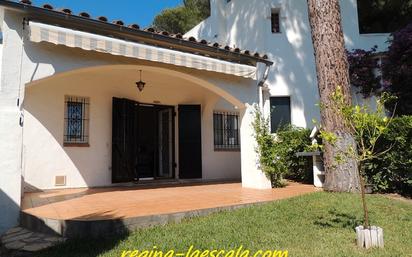 Agradable casa adosada, con jardín privado y piscina comunitaria. Todo planta baja. CON LICENCIA TURÍSTICA ! Con 2 dormitorios, 2 baños, salón-comedor con TV alemán/francés, aire acondicionado, cocina americana, terraza con barbacoa -ideal para comer al exterior- y terraza-solarium en la parte superior de la casa, con acceso a través de una escalera exterior. Con un garaje repartido en dos partes, una como trastero y la otra como lavadero. Lista para entrar a vivir. La playa de arena más cercana a la casa es la de Riells. A 1 km.
