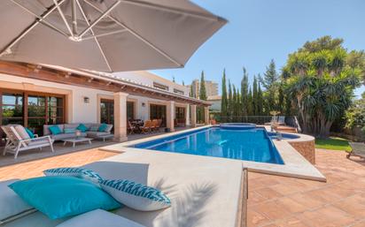 Villa familiar renovada y ampliada situada en una tranquila zona residencial de Palmanova. La propiedad se encuentra sobre un solar de 2000 m2, tiene una superficie construida de 750 m2, incluyendo terrazas cubiertas de 60m2, además de 100 m2 de terrazas descubiertas. Se distribuye de la siguiente manera: enorme vestíbulo, amplio salón comedor con techos de doble altura y chimenea, cocina americana, coladuría y aseo de invitados. En el mismo nivel encontramos 2 dormitorios con baños en suite. El nivel superior consta del espacioso dormitorio principal con habitación vestidor y baño integrado. En el área del jardín se halla una casa para invitados con un salón, un dormitorio y un baño en suite. La amplia piscina (15x6 metros) dispone de una zona de jacuzzi. Otras características a destacar: calefacción central de gas, aire acondicionado frío/calor, garaje. A tan sólo pocos minutos se encuentra la playa, cafés y restaurantes. La capital palmesana se puede alcanzar en 15 minutos en coche.