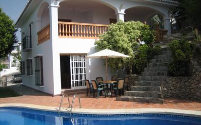 Chalet en Nerja con unos 120 m2, parcela de 300 m2, 3 dormitorios, 2 baños, salón-comedor, cocina equipada, semi amueblado, salita, garaje cerrado, jardines, piscina privada y a solo 5 minutos de Nerja.