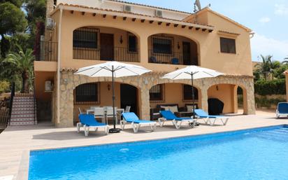 ALQUILERES DE INVIERNO (entre noviembre a finales de marzo, mínimo 2 meses) al precio indicado; otros períodos, así como la disponibilidad, consulte en https://www.locationmoraira.com/propiedad/villa-casa-mia-moraira-casa-mia/ CASA MIA Licencia Turística AT-477541-A, NO LARGAS ESTANCIAS. A tan solo 400 metros del pueblo de Moraira, para ir a pie a todas partes, villa de 4 dormitorios, piscina privada (nueva 2020) y gran terraza, aseo exterior, pequeño jardín con césped, barbacoa de gas, garaje, aparcamiento dentro de la parcela para varios coches. Aire acondicionado (frío/calor). La casa consta de 2 plantas, la planta baja consta de un garaje, una gran terraza alrededor de la piscina, un porche, un salón-comedor con chimenea, 1 aseo con ducha, una cocina y 1 dormitorio doble con cama de 1,35. La planta superior, con acceso desde una escalera exterior, se compone de una terraza alargada con acceso a: a) habitación doble con 2 camas de 90 y baño en suite; y b) hall de entrada, 2 dormitorios dobles (uno con 2 camas de 90 y el principal con 2 camas juntas de 90), y aseo con ducha. Aire acondicionado (frío/calor) en el salón, en el dormitorio independiente con baño y en el dormitorio principal de arriba. Ventilador de techo en la sala de estar y en 3 de los dormitorios. Mosquiteras en todas las ventanas. NO se admiten mascotas. Solo se permite fumar en las áreas al aire libre. En temporada alta la estancia mínima es de 2 semanas, con el día de llegada y salida el sábado (check-in después de las 16h; check-out antes de las 10h) Los precios en temporada baja (de noviembre a finales de marzo) son para un máximo de 2 dormitorios. Para los 4 dormitorios, hay un cargo extra de 100 €/semana.