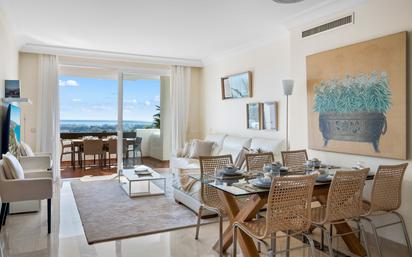 Precioso apartamento con orientación sur disponible para alquiler de larga temporada, que ofrece impresionantes vistas frontales al mar. La propiedad ha sido completamente reformada y amueblada a estrenar, con 105 m² construidos y una amplia terraza de 29 m², ideal para disfrutar durante todo el año. El apartamento dispone de dos dormitorios y dos baños modernos, una cocina totalmente equipada y una zona de lavandería independiente. El luminoso salón-comedor tiene acceso directo a la terraza, creando un espacio cómodo y funcional con abundante luz natural. Entre sus extras se incluyen sistema de alarma y conexión de fibra óptica de alta velocidad. La vivienda cuenta además con plaza de garaje y trastero. Ubicado en una urbanización bien cuidada con amplios jardines, piscinas y gimnasio comunitario, el inmueble ofrece un entorno tranquilo con excelentes servicios, ideal para una cómoda vida a largo plazo.