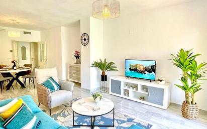 DESDE MARZO Totalmente renovado, moderno, luminoso y bien distribuido, este apartamento bajo, muy elevado, con terraza acristalada y jardín privado está ubicado en una de las mejores zonas del este de Marbella, cerca del Puerto de Cabopino y Cabopino Golf. Consta además de tres dormitorios, el principal en suite, un amplio baño que comparten los demás dos dormitorios y una cocina funcional, moderna, totalmente equipada, abierta al gran salón hacía la terraza y el jardín. Está orientado al sur y es una esquina del edificio. La terraza acristalada es una segunda sala de estar, con amplias vistas a la gran piscina comunitaria, los edificios bien mantenidos y llenos de jardineras con plantas y flores, y se aprecia un poco el mar. Se vende con plaza de aparcamiento en le sótano del edificio, tiene toda la documentación en regla, licencia para alquiler turístico, a un precio muy interesante. Este precioso hogar de una familia es también una oportunidad de inversión o casa para vacaciones; ¡todo al mismo tiempo! Todo mobiliario no incluido en el precio es negociable.