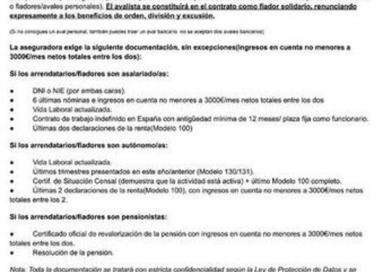 Si sigues interesad para verificar que todo encaja con los requisitos de la aseguradora(Requieren dos personas físicas que acrediten solvencia económica, ya sea en calidad de arrendatarios o fiadoresaval personal), necesitarás enviarme la siguiente documentación de los dos arrendatario(O fiadores) que vivirían en la casa. El avalista se constituirá en el contrato como fiador solidario, renunciando expresamente a los beneficios de orden, división y excusión.