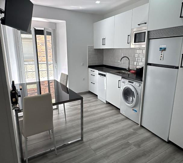 Salón amueblado con sofá, mesa comedor con sillas y TV. La cocina se encuentra equipada con microondas, nevera-congelador, lavadora y lavavajillas, cuenta con una salida directa a un balcón que da al exterior.