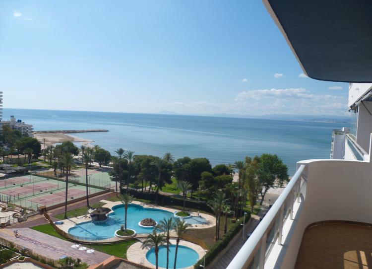 Cosnta de 3 domitorios , 2 baños cmpletos , cocina equipada , comedor y terraza con vstas al mar . Piacina , tenis y club social . Garage opcional para coche grande .