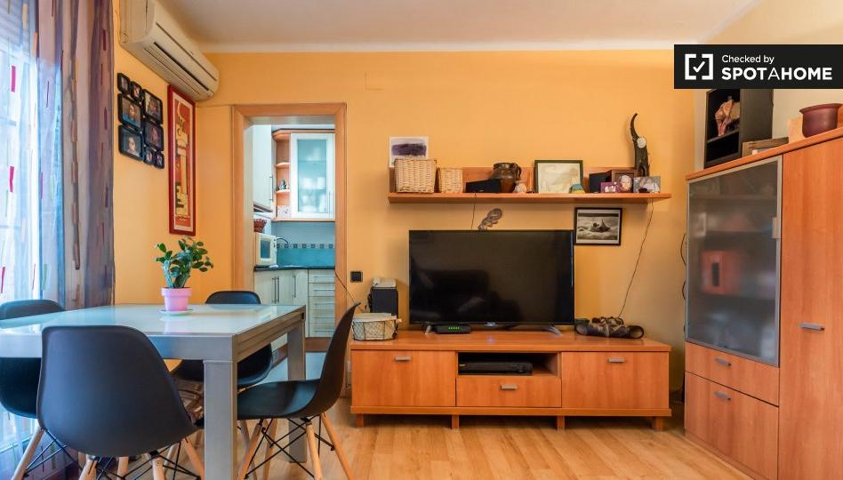 ** Lo que quieras ** _Porque puedes hacer tu propia marca._ ** ¿Me gustará aquí? ** Posiblemente. ¿Ha estado buscando una configuración discreta, sin complicaciones y fácilmente personalizable? ¿Sí? Sigue leyendo... **¿De Verdad? Dime más...** Tienes los ingredientes de una casa en este encantador. Tome el sol durante el verano en el amplio balcón o ponga los pies en la sala de estar. Felicidad. Creemos que es ideal para una pareja de posgrado relajada o un individuo que busca un lugar para establecerse. ¿No te apetece cocinar una noche? Estás de suerte, estás rodeado de deliciosas comidas. ** Sus 3 razones principales para vivir aquí: ** - Salga para encontrar una aventura diaria, ya sea un simple viaje de compras o un viaje en metro al centro de Barcelona. - Configuración de una zona zen de entretenimiento al aire libre en la terraza. Elegante. - Deje que sus problemas se vayan flotando mientras toma una bebida fría en la sala de estar. ** Pero necesitas saber esto ... ** - El dormitorio 2 no tiene cama, pero eso te da opciones. ¿Agregar tu propia cama o convertirla en una sala de estudio privada? Decisiones decisiones... **Y esto...** - Se permite fumar en todo el apartamento. ** Nuestro Homechecker, Andrea, dijo: ** _ \"Este apartamento está muy bien ubicado, con 2 líneas de metro a poca distancia. ¡Que conveniente!\"_ ** Dame esto directamente ... ** Este es un acogedor apartamento de 2 dormitorios en Carrer Iberia, Barcelona. Cuenta con una acogedora sala de estar con acceso a una hermosa y soleada terraza. Creemos que este apartamento es perfecto para una pareja de posgrado relajada o un individuo que busca una vida fácil. Viajar no es un problema aquí con 2 estaciones de metro cercanas. Uf. ¿Fumador? Siéntase libre de iluminar en este apartamento.