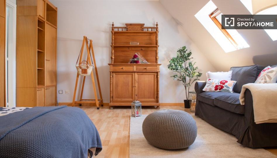 Descubre este estudio cuidadosamente amueblado, ubicado en la vibrante Las Rozas de Madrid, ideal tanto para estudiantes como para profesionales. Este moderno estudio ofrece lavadora y secadora privadas, cocina equipada y aire acondicionado individual. El acceso es sencillo gracias al ascensor, y otras ventajas, como el acceso a la piscina, mejoran aún más tu experiencia. Aunque el wifi y los servicios básicos como agua, electricidad y gas están incluidos para tu comodidad, ten en cuenta que esta propiedad tiene restricciones que prohíben mascotas, fumar y alojar huéspedes para garantizar un ambiente tranquilo.