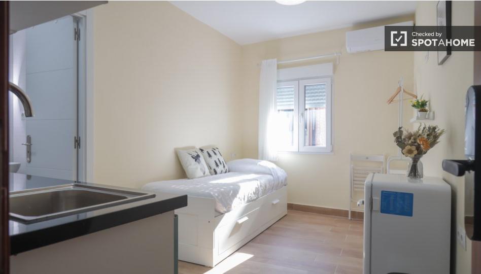 Este estudio completamente amueblado en Bellas Vistas, Madrid, ofrece una experiencia de vida cómoda. Con equipamientos como lavadora y secadora privadas, y todos los gastos incluidos (agua, luz, gas y wifi), la comodidad y la sostenibilidad están garantizadas. La propiedad también cuenta con aire acondicionado que también funciona como calefacción, lo que garantiza un confort perfecto. Spotahome ha revisado personalmente esta propiedad, manteniendo nuestros altos estándares de calidad en espacios de vida verificados.
